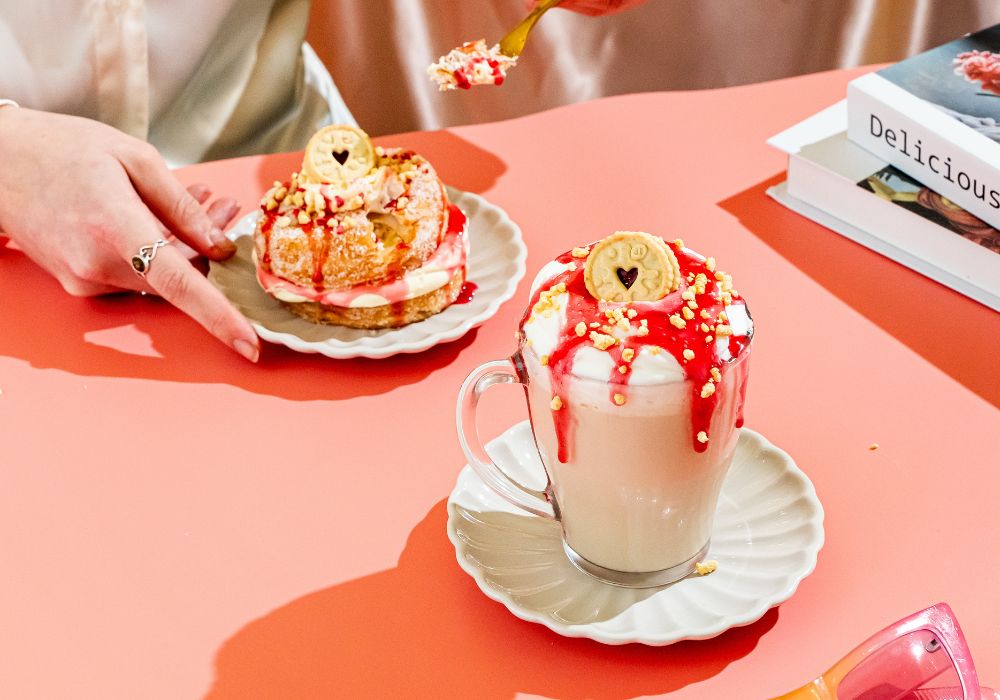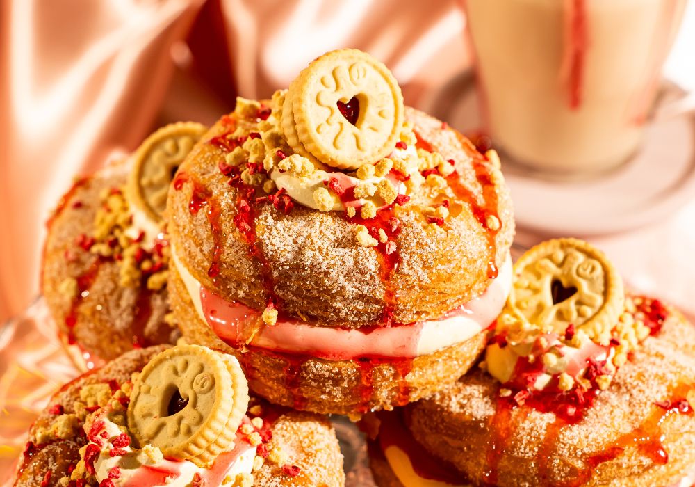 The Jammie Dodgers SOnut is a flaky, sugar puff-pastry treat inspired by the unmistakable charm of Jammie Dodgers, featuring a luscious filling, buttery biscuit crumbles, and a signature heart-shaped garnish.